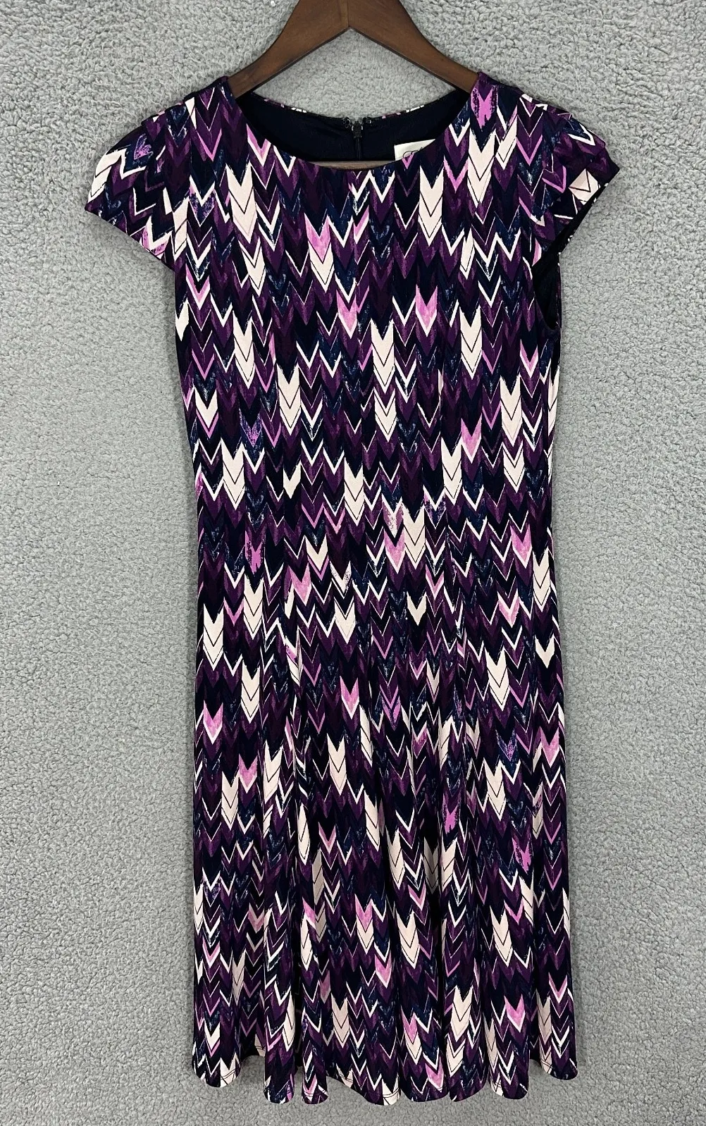 Eliza J Dress 0P Pink Purple Chevron Geometric Print Mod Party Retro Striking geometric print fit and flare dress by Eliza J, size 0P (Petite). Bold chevron zig-zag pattern in shades of pink, purple, and navy. Fully lined with back zip closure. A playful yet sophisticated piece perfect for retro lovers, mod-inspired looks, or statement dressing. Made in Vietnam. mod, retro, geometric print, chevron, Y2K revival, bold, colorful, dopamine dressing, party, petite, artistic, indie #ElizaJ #RetroStyle #ModDress #DopamineDressing #PetiteFashion