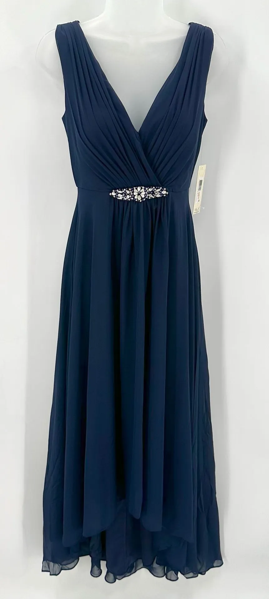 Eliza J Dress Womens 2 Navy Blue High/Low Chiffon Gown Formal EJM0866 Wedding Dark blue navy formal gown features a long length high-low hemline and v-neckline. Sleeveless surplice/vneck bodice has soft pads for coverage and light support at bust. Rhinestone embellishment at waist. Back zip closure. Fully lined with chiffon overlay. Tag size 2 womens; dry clean only. CONDITION NOTES: There is a snag/run in the inner lining of dress; noted in photos. Original retail tags attached; paper tag has some damage from sticker removal. Gown is unworn. Ships boxed. See photos for details and approximate flat lay measurements to determine fit.