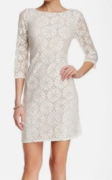 ELIZA J Ivory Floral Lace Overlay 3/4 Length Sleeve Boatneck Shift Dress - Great condition, see all... Show more