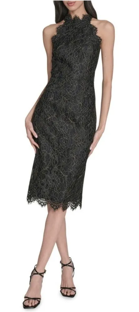 Eliza J Women's Metallic Eyelash Lace Midi-Dress Color: Black/Gold Size: 16 BRAND NEW, NEVER WORN, NO TAGS This Eliza J midi dress features a lace sheath silhouette with a Mock turtleneck and sleeveless design. Mock turtleneck Sleeveless Concealed back zip closure 97% nylon/3% metallic Lining: 96% polyester/ 4% spandex Dry clean