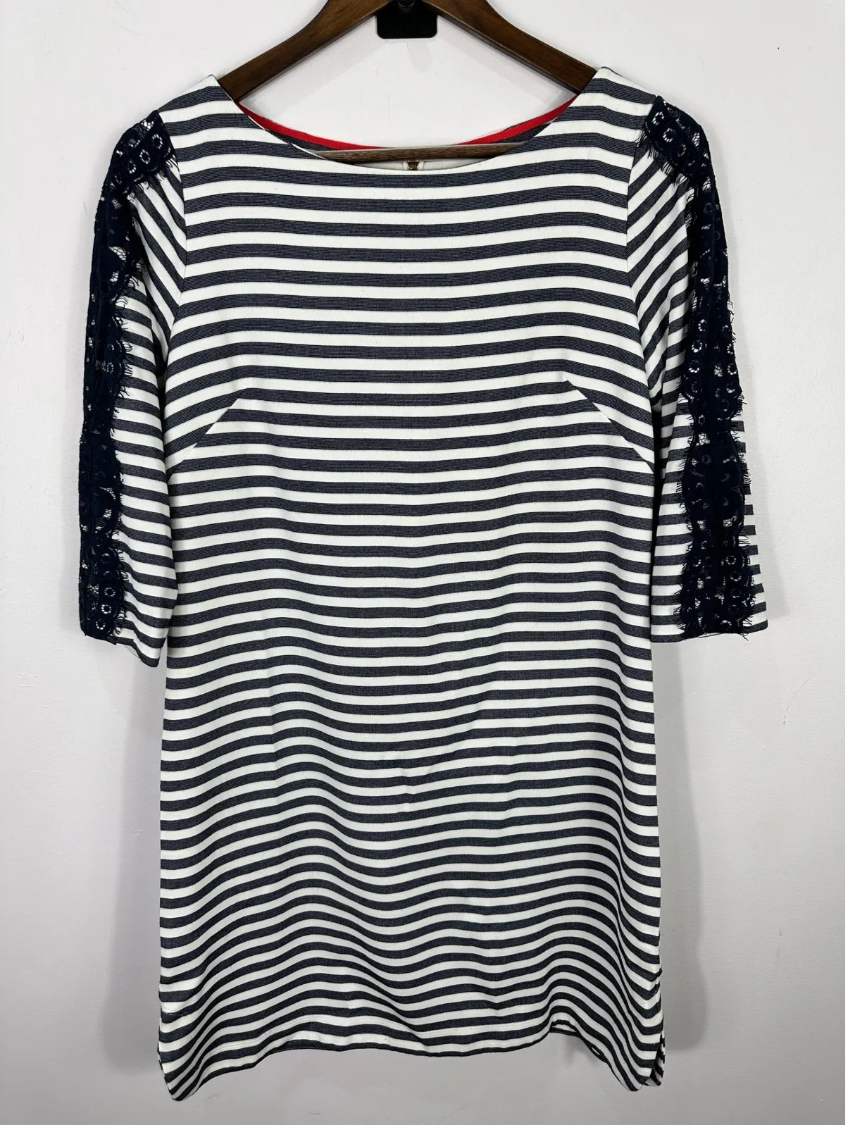 • Shift dress silhouette • Navy + white stripe pattern • Lace sleeve detail • Half sleeves • Back zip closure • Stretch comfort fabric • Fully lined • Style: Classic / Nautical / Preppy / Resort Chic Fabric of dress : 59% Polyester 38% Rayon 3% Elastane Combo trim: 58% Polyamide 42% Cotton Care: Dry Clean