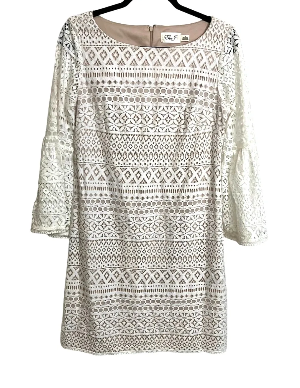 Eliza J Dress Womens 6 White Nude Geometric Lace Bell Sleeve Sheath Eliza J sheath dress in white with nude lining featuring intricate geometric lace overlay. Elegant 3/4 length bell sleeves and round neckline create a sophisticated silhouette. Full zip back closure for easy on and off. Cotton nylon blend lace exterior with polyester lining. Style: NO7M1640 Armpit to Armpit: 18" Across Waist: 16" Dress Length: 35.5" Sleeve Length: 21" Condition: Excellent pre-owned condition