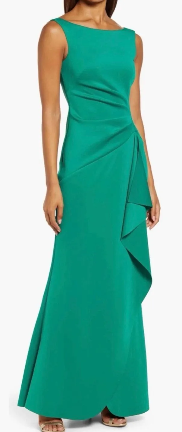 Embody ultimate glamour at your next formal event in this alluring sleeveless gown from Eliza J, featuring a smooth scuba fabric. Features Approx. 52" long from center back neck to hem. Length is based on size 4 16” across chest Floor-length formal dress Scuba: Structured and supportive Boat neckline; gown silhouette Back zipper closure Ruched at front waist; cascading side ruffle and faux-wrap detail at skirt; V-back style