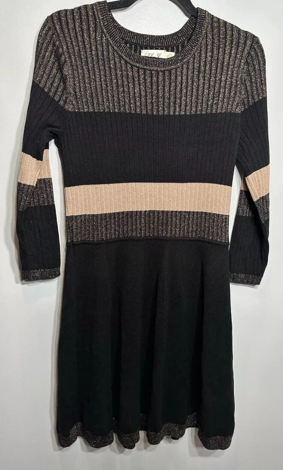 This Eliza J sweater dress is a stylish and cozy choice for the winter and fall seasons. The dress features a colorblock design in black with a shimmer effect, adding a touch of holiday sparkle. It has long sleeves, a round neckline, and a pullover closure for easy wear. Made of acrylic knit fabric, the dress is in a fit & flare style with an A-line silhouette, hitting at knee length for a classic and colorful look. Perfect for casual occasions, this dress is a size Large and is sure to keep you both comfortable and fashionable.