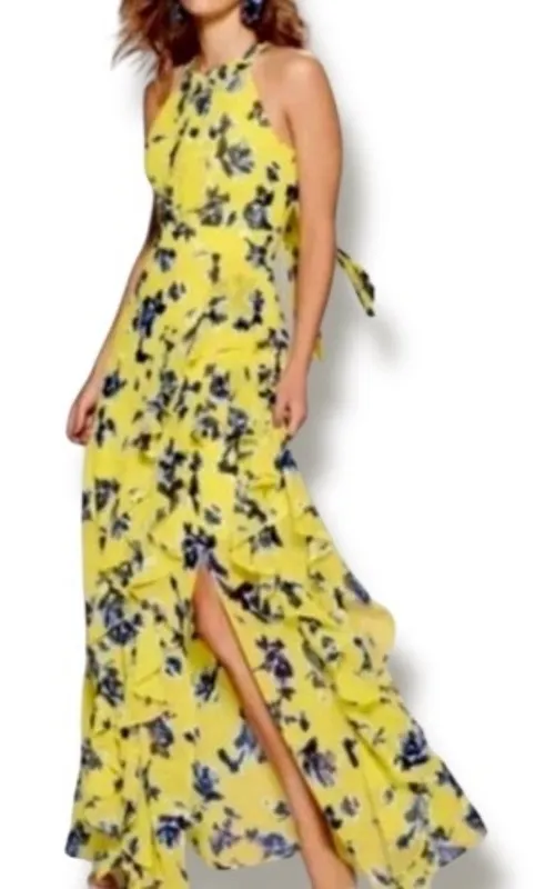 Eliza J women’s maxi dress Bright yellow with blue floral print Sleeveless halter neckline with tie... Show more