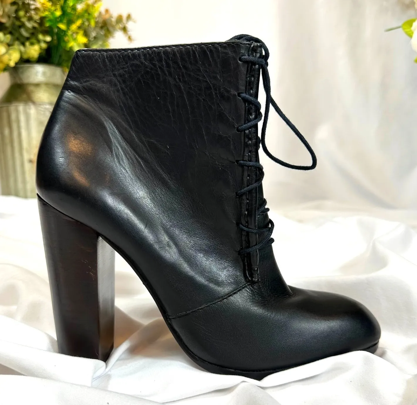MSRP $398.00 Chic black heeled boots with lace-up design. Perfect for stylish outings. Classic black leather boots with black decorative shoe laces, gold tone side zipper, 4.5" burgundy almost black heel. No box. These leather lace-up booties feature a hidden zip on the inside of the boot. Stacked heel. Leather sole. Leather: Cowhide Made in Brazil New without box
