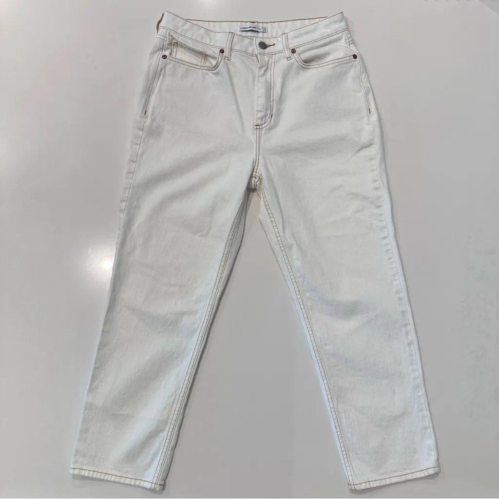 Excellent condition- Like New Size 10 / 30 Please see pictures for measurements White denim with contrast stitching Elizabeth and James PRODUCT DETAILS 5 pocket design Sewn-rolled hem Stretch denim construction High rise Straight leg fit FABRIC & CARE 99% organic cotton, 1% spandex Machine wash Imported SUSTAINABILITY FEATURES Organic cotton Global Organic Textile Standard Certified