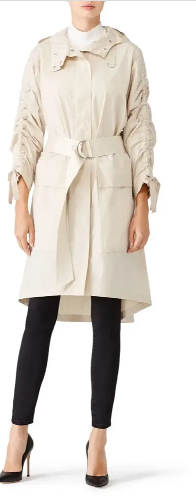 RTR Elizabeth and James Bowery Cream Oversized Ruched Sleeve Jacket The elegant cream hue offers endless versatility, making it the perfect layering piece for any wardrobe. The oversized silhouette provides a relaxed yet polished vibe, ideal for both casual and formal occasions. The standout feature of this jacket is its ruched sleeves, adding a contemporary and playful touch to its classic structure. Crafted from high-quality materials, it drapes beautifully and ensures all-day comfort. The open-front design makes it easy to layer over dresses, blouses, or sweaters, offering endless styling possibilities. Whether you're dressing up for the office or creating a stylish weekend look, this Elizabeth and James jacket is a must-have for elevating your outfit. Its sophisticated details and modern oversized fit make it a standout addition to your outerwear collection. Long sleeves (when not ruched) Zip and snap front Large front pockets Hooded Knee length Solid cream / beige color Polyester / polyurethane shell Cotton / silk combo Polyester / cotton lining Size: M Measurements are provided in pictures Condition: Excellent, little discoloration on front from snap, and there is no belt included (pictured) tags: workwear, business casual, office chic, evening wear, transitional style, fall fashion, winter fashion, sophisticated outerwear, upscale dinner, date night, formal event, modern elegance, minimalist fashion, trendy jacket, polished look, refined fashion