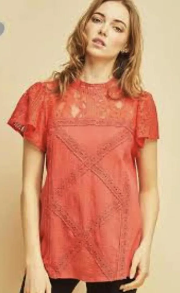 Measurements are approximate and given for reference. P2P: Approximately 17.5 inches Length: Approximately 23 inches Size: Small Condition: Lightly worn with no visible signs of wear or damage. This women's blouse features a vibrant coral color with intricate lace detailing on the upper chest and sleeves. The short sleeves and keyhole button closure at the back add a delicate and feminine touch. The main body of the blouse is made from a soft, lightweight fabric for comfortable wear. Ideal for casual or semi-formal occasions.