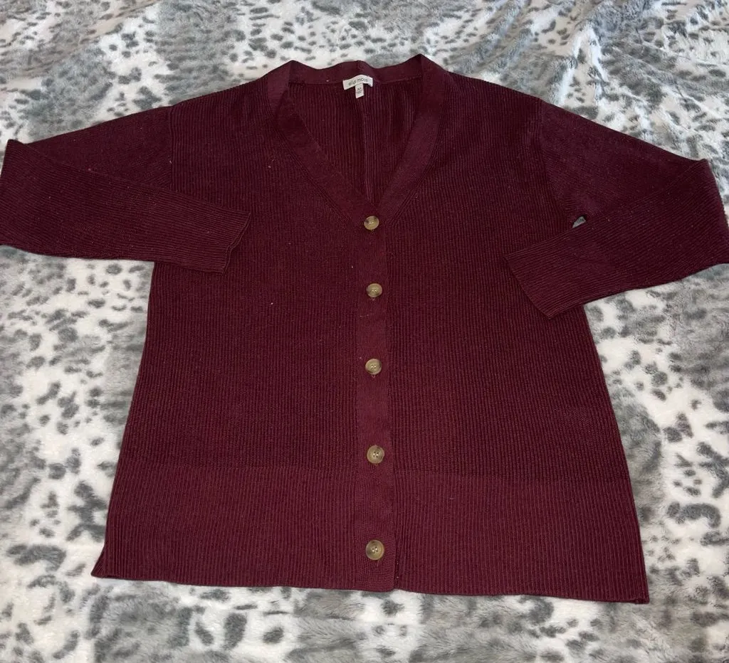 Burgundy cardigan V-neck Long sleeve Ribbed texture 5 button closure Polyester/nylon blend fabric... Show more