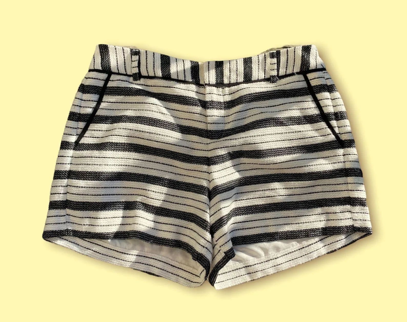 A very cute and preppy knit pair of shorts in a black and white soft knit fabric with black piping along the pockets. The brand is Elle and the size is 6. Polyester. Waist: 16”, Rise: 11”, Inseam: 3”, 6.7oz #preppy #stripe #knit #oldmoney #retro