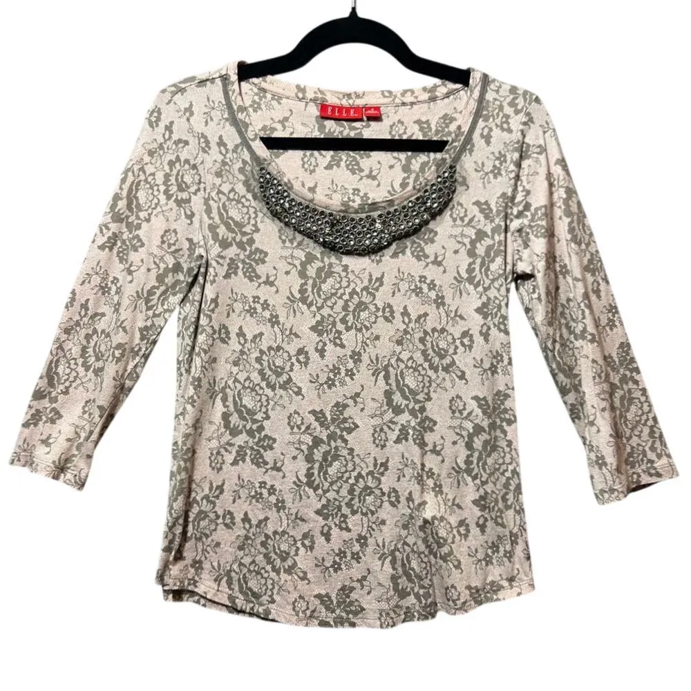 Beautiful ELLE top featuring a delicate gray floral print on a light pink background. 3/4 length sleeves with a flattering scoop neckline adorned with silver beaded embellishments. Made from a soft and comfortable blend of 60% Pima cotton and 40% modal. The top is in excellent condition with no visible flaws. The beaded neckline adds an elegant touch to this versatile piece. Color: Pink Type: Blouse Department: Women Style: Basic Material: Cotton Blend Neckline: Scoop Neck Sleeve Length: Long Sleeve Sleeve Type: Classic/Fitted Sleeve Pattern: Floral Accents: Beaded Features: Scoop Neckline, Stretch Material, Soft Fabric Blend, 3/4 Length Sleeves, Easy Care Fit: Classic Keywords: floral print, beaded neckline, scoop neck, long sleeve, cotton modal, embellished, casual top, pima cotton, stretch, feminine