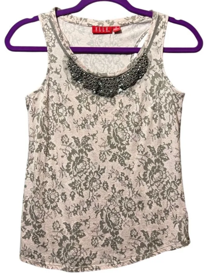 Beautiful ELLE tank top featuring an all-over gray floral print on a pink background. Elegant built-in beaded necklace detail at neckline in gunmetal gray. Made from a soft and comfortable blend of 60% Pima cotton and 40% modal. Tank style with scoop neck. In excellent condition with no visible flaws. Beading is intact and secure. Type: Tank Department: Women Style: Basic Material: Cotton Blend, Modal Neckline: Scoop Neck Sleeve Length: Sleeveless Sleeve Type: Strappy Sleeve Pattern: Floral Accents: Beaded Features: Scoop Neckline, Built-in Beaded Necklace, Sleeveless Design, Soft Fabric Blend, Easy Care Fit: Classic Keywords: elle, tank top, beaded neckline, floral print, scoop neck, sleeveless, embellished, pima cotton, modal, gray floral, beige tank, gunmetal beading