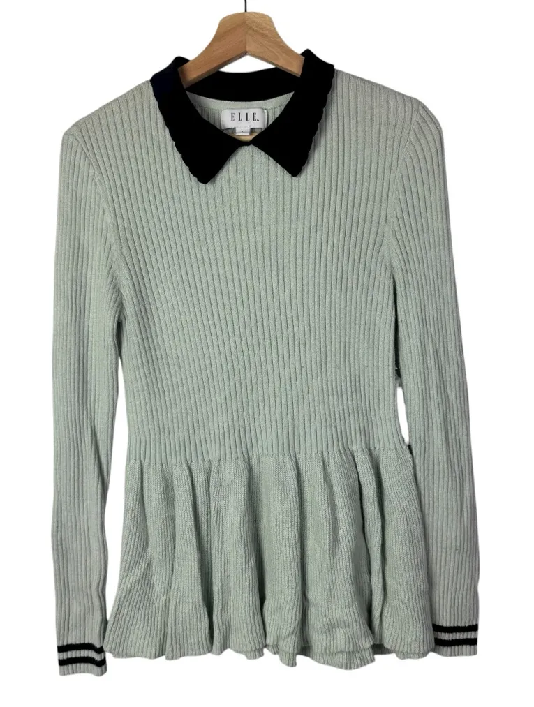 Elle Mint Green Ribbed Black Collar Peplum Long Sleeve Knit Top Good used condition, minimal signs... Show more