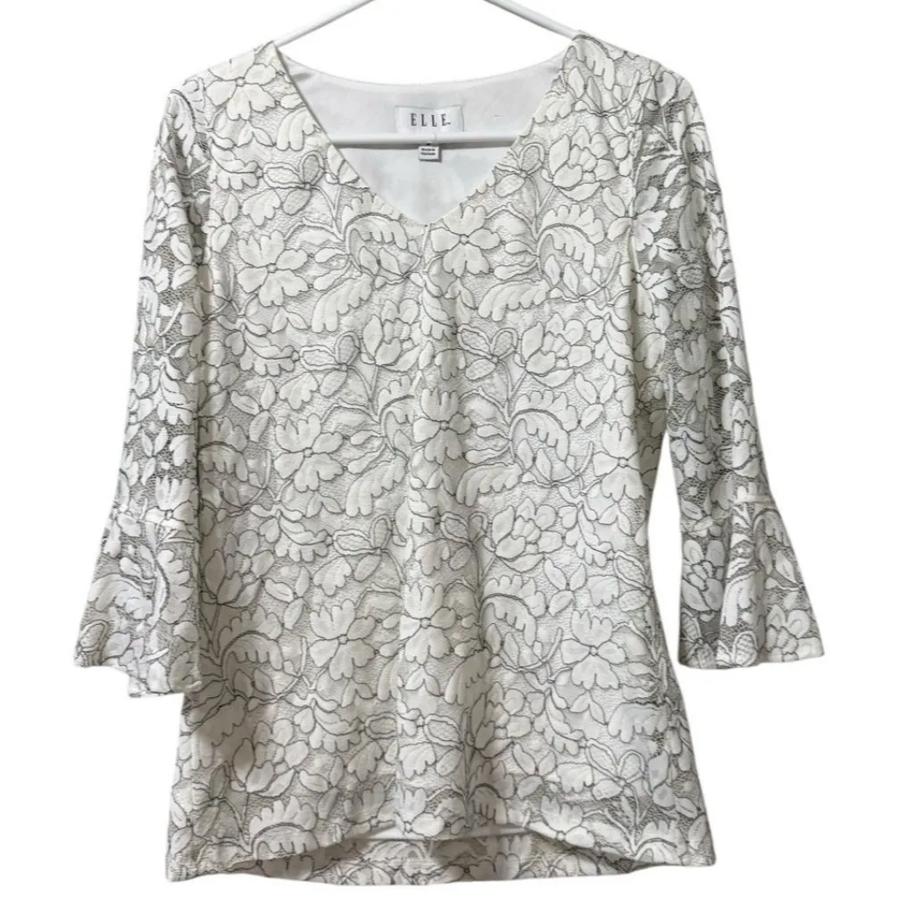 This shirt is preowned and in great used condition! ELLE white floral lace lined Scoop Neck 3/4 bell sleeve blouse women's size Medium ***Please be advised, color may appear more vibrant, lighter/darker in pictures due to flash, contrast, lighting or your phone/computer screen set up, etc. I try to described color as best as possible. I do check every item very closely while taking pictures and while packing it for shipping but it is very easy to still miss a stain or small damage. So please, if you receive an item with a defect not mentioned on the description, message me and I will do my best to fix the problem.Thank you! This item is pre-owned. Any questions please dont hesitate to ask.