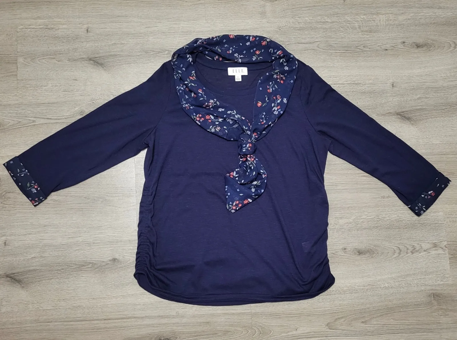 An ELLE navy top with a charming floral print accent and scarf. This top features flattering ruched detailing on the side and 3/4 length sleeves with a coordinating floral print cuff. Perfect for casual outings or a relaxed day at the office. Keywords: ELLE, navy top, floral print, ruched, 3/4 sleeve, womens top, casual top, comfortable, daytime, workwear, relaxed fit Pre-owned in good condition with plenty of life left see all photos for condition, signs of wear and measurements. If unsure about size, please compare measurements to similar item you already own. As with all pre-owned items please expect minor signs of wear.