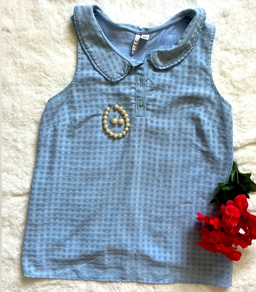 Front: Polyester- rayon Back: Rayon Lining: Plyester Machine wash cold-tumble dry low Color: water green Pattern: solid Aproximate Flat Lay Measurement are: Length: 23" hip width: 18 Size: XS Elevate your style with our light blue sleeveless blouse, delicate baby neckline and exquisite pleats. Size XS for an impeccable look - elegance at its finest! has a detail on the back of the lining, it can be seen in the last two photos All reasonable offers are accepted Thank you for visiting my store and buying