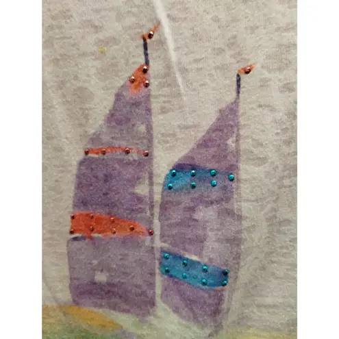 Ellen Negley Women's Size Large Yellow Pink Art-To-Wear Artsy Tropical Beach Embellished T-Shirt Ve... Show more