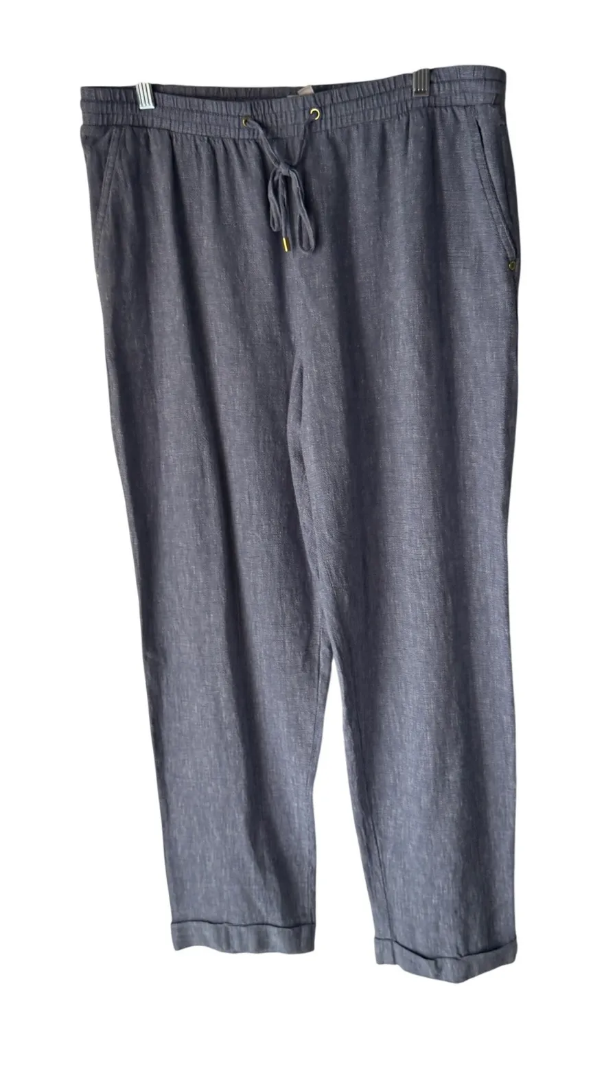 Measurements: • Waist: 34 in • Inseam: 29 in Style: Jogger Department: Women Material: Linen, Rayon Leg Style: Tapered Type: Pants Fabric Type: Linen Features: Pockets, Lightweight, Elastic Waist, Adjustable Waist, Cuffed Closure: Drawstring, Pull On Pattern: Solid Accents: Zipper Occasion: Casual Inseam: 29 in Waist Size: 30 in Fit: Relaxed Keywords: linen pants, drawstring pants, women's trousers, casual bottoms, lounge pants, relaxed fit, summer pants, lightweight, blue apparel, comfort wear, everyday, basic, athleisure FAQS: We ship out items every 1-2 days due to high volume shipping the mail carrier does not scan the items until it reaches the next facility.This can take up to 48+Hours for tracking to update. We provide measurements in the photos as well as the descriptions. We add as many details as possible until the item is put into inventory. We are unable to take the item out of inventory for additional information. Due to a high volume store we are unable to answer these questions individually.