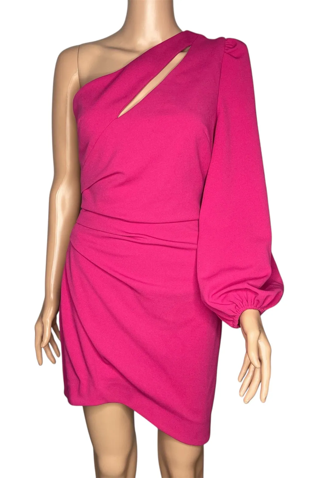 Elliatt Bermuda Mini Dress in Crepe Fuchsia (bright pink) size XS New with tags with imperfections. Light snag at the back on left leg. Opting for minimal design details, the Bermuda dress features a one-shoulder, slightly draped mini silhouette with a chest cut-out. • One-shoulder neckline • Cut-out detail on chest • Balloon sleeve with elastic cuff • Side-seam zip closure • Draped effect on waist • Lined • 98% polyester; 2% Spandex • Hand wash or Dry clean Approximate measurements without stretch Chest: 31” Waist: 25” Length: 34” Tags: one shoulder dress, hot pink dress, fuchsia cocktail dress, puff sleeve dress, statement sleeve, bodycon mini, cutout neckline, asymmetrical dress, ruched waist, party dress, evening dress, special occasion, modern chic style, date night outfit, wedding guest dress