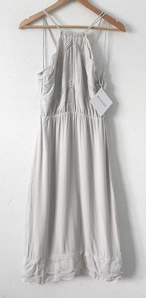 NWT Elliatt Elation Ruffle Halter Wedding Guest Midi Dress in Taupe size M. Chic, feminine, and effortlessly elegant. This Elliatt Elation midi dress features a flattering ruffled halter neckline and soft taupe/light gray tone, perfect for weddings, brunches, and elevated events. The sleek midi silhouette creates a timeless look with a modern edge. ✨ Why you’ll love it: • Ruffle halter neckline for a romantic, elevated feel • Sleeveless midi length — flattering and versatile • Fully lined with a back zipper closure for a polished finish • Lightweight and elegant — ideal for wedding guest, bridal shower, cocktail, or brunch wear 📏 Details: • Size: M • Color: Taupe / Light Gray • Length: Approx. 46” • Bust: 19.5” | Waist: 17.5” • Condition: New With Tags (NWT) • Brand: Elliatt A timeless neutral midi dress that transitions beautifully from daytime events to evening soirées.