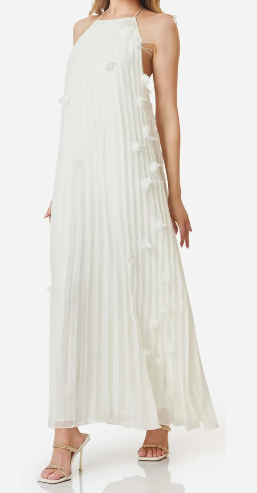 New without tags! A maxi dress that is just as cute as it is comfortable.Elevate your evening ensemble with the Emelia Floral Appliqué Pleated Georgette Halter Maxi Dress by ELLIATT in timeless ivory. This sleeveless maxi dress, crafted from 100% polyester, features a stunning 53" silhouette adorned with soft pleats and delicate floral appliqués. Its halter neckline ties elegantly at the back, creating an alluring open design that's perfect for spring events. Imported with care, this dress requires dry cleaning to maintain its ethereal allure. tags: graduation, bride, bridal, wedding, wedding rehearsal, bachelorette, engagement photos, honeymoon, bridal shower