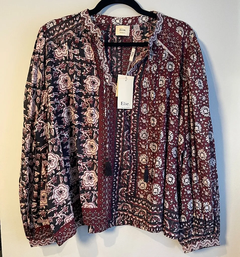 Lightweight, non-stretch voile Floral print Pullover style Long puff sleeves with button cuffs Split V neck with tassel tie closure 100% cotton Wash cold or dry clean Approx. Measurements: Sleeve length: 26" Shoulder to Hem Length: 24" Pit-to-pit: 28" Retail $285