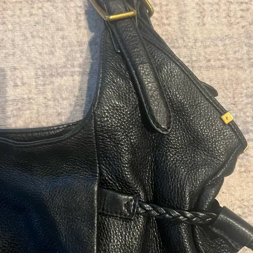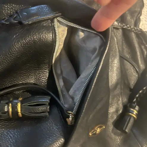 Full grain black buttery smooth pebble leather featuring antique brass hardware, Magnetic top closure, Very clean interior with pockets and zippered pouch, two exterior pockets with vertical zippers, and braided tassel accents about 14” wide 14” tall 4” deep