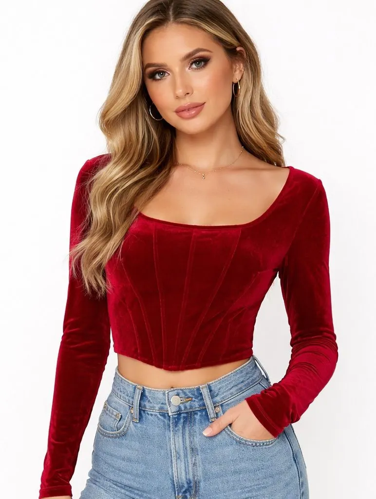 The Elodie RED VELVET Corset Style Top in size S is a stylish and edgy addition to any woman's wardrobe. This crop top features a scoop neckline, long sleeves, and a slim fit, making it perfect for a party or cocktail occasion. The red velvet fabric adds a touch of whimsy, while the corset accents give it a unique and trendy vibe. Made from a blend of polyester and spandex, this top offers both comfort and style, making it a versatile piece for any season.