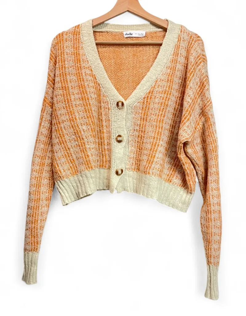 Elodie Womens Orange Cream Cropped Cardigan Knit cottagecore Sweater Large - relaxed fit - drop shoulder Flat lay measurement: - length: 19" - ptp: 26" Excellent preloved condition, no noticeable flaws. See photos for details and condition. Exact item pictured will be shipped. Cottagecore, twee, preppy, cropped, kawaii, retro style, coastal grandma, normcore, winter, sweater weather, cozy, boho, coquette