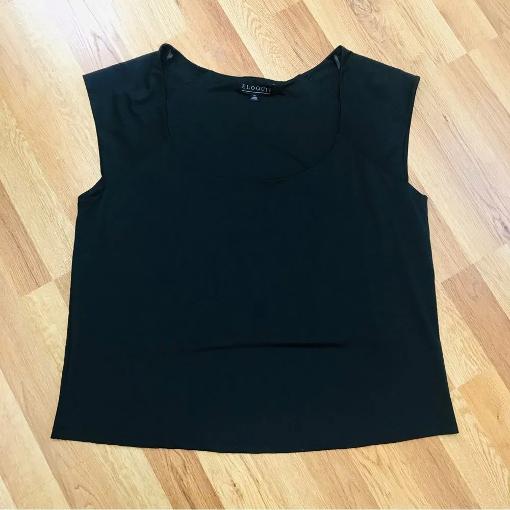 Eloquii Black Sleeveless Scoop Neck Crop Tank Blouse Condition: pre-owned - very nice condition with no known flaws Size: 22 Low cut scoop neck Sleeveless Slightly cropped length Classic / Neutral / Office / Career / Layering Thanks for looking! Y
