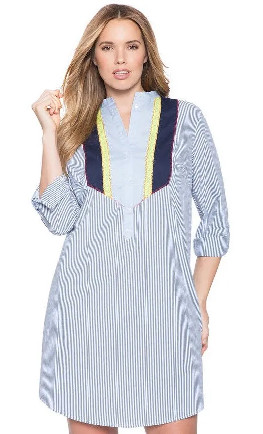 Blue Pinstripe Colorblock Bib Shirt Dress Size 18- Eloquii Color: Blue and White Size: 18 Description: •Classic Eloquii shirt dress featuring blue-and-white pinstripes with a statement colorblock bib detail. Designed with a split neckline, button-front placket, and roll-tab sleeves for versatile styling. Easy, polished silhouette perfect for work or everyday wear. **Pre-owned. Gently used. In great condition.** Tags: romantic, long sleeves, brunch, day time, valentines, date night, sexy, curvy, plus size, trendy, business casual, preppy, minimalist