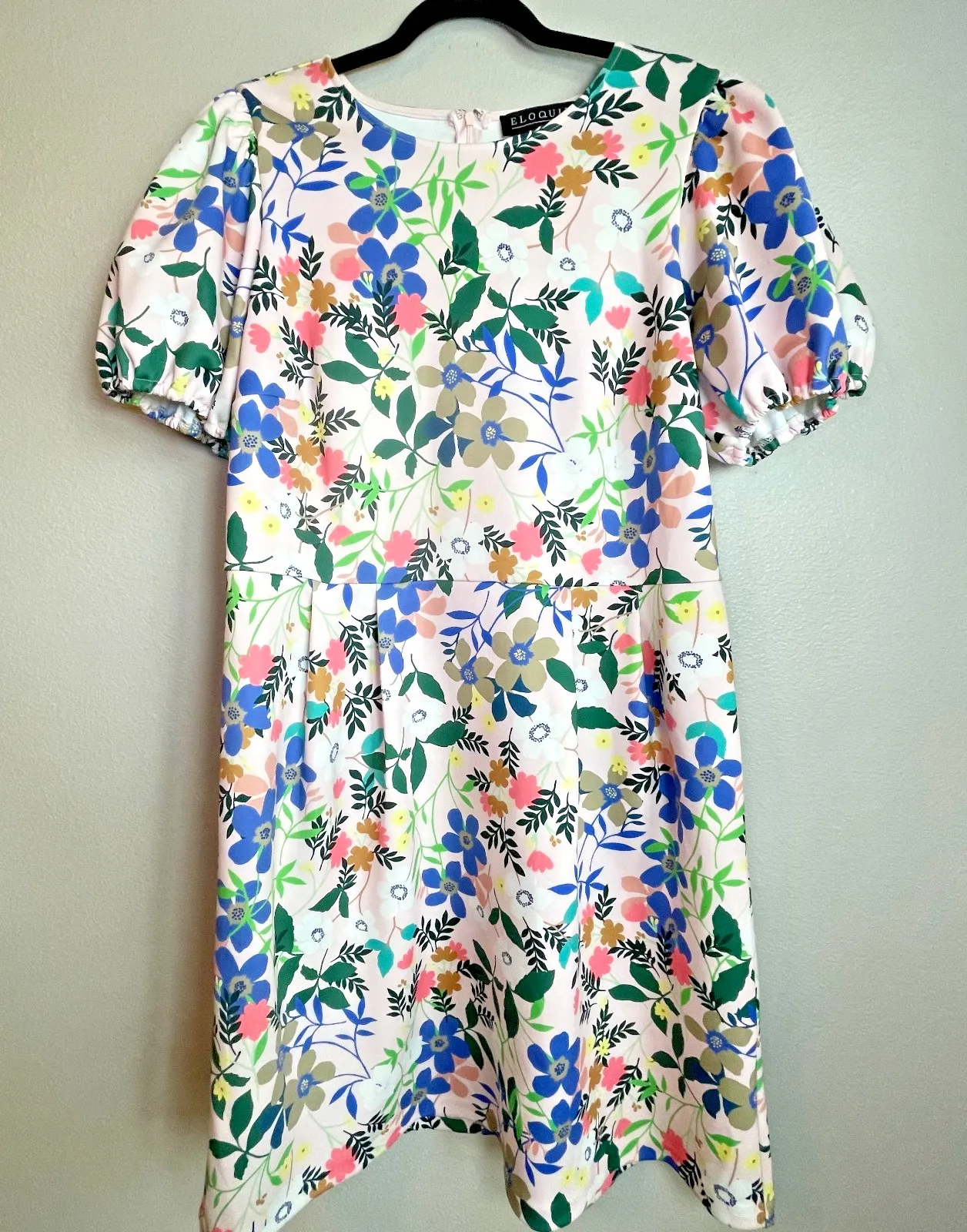 Measurements: p2p 22", length 40.5", waist 40". The Eloquii dress in size 16 features a floral pattern with puff sleeves and a fit and flare style, making it perfect for a wedding, party, or cocktail event. The knee-length dress has a boat neck and short sleeves, made from a comfortable blend of polyester and spandex. The multicolor design is ideal for summer, fall, and spring seasons, adding a touch of elegant flair to your special occasion.