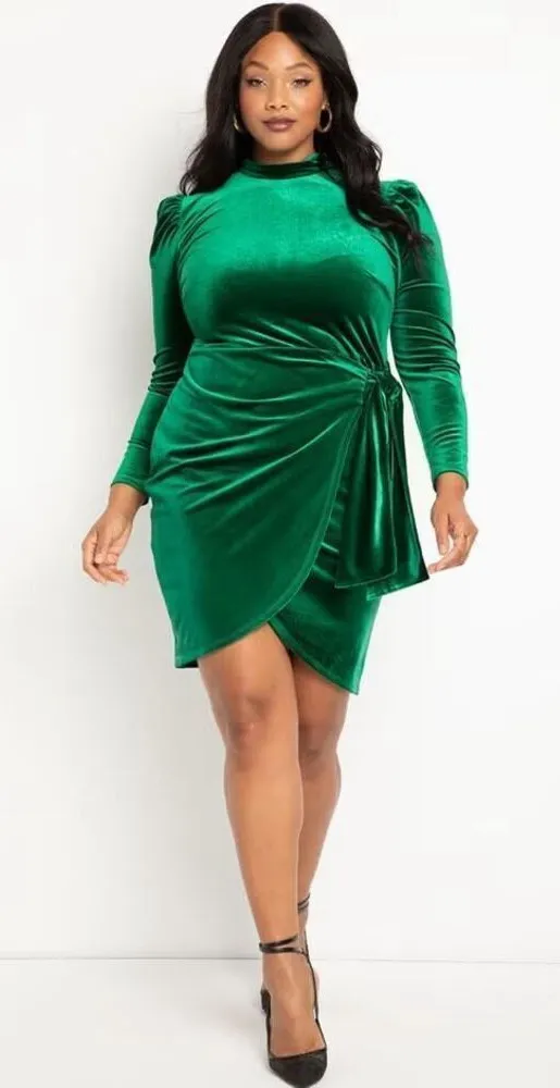 ✨Eloquii Velvet Mini Dress with Wrap Skirt Size: 22 Color: Green Snug fit Back zipper Leg-o-mutton sleeve Wrap skirt detail Stretch knit velvet Hits above the knee Body length on size 18 is 40 1/2" 93% Polyester/ 7% Spandex Care: Machine wash cold gentle cycle with like colors. Only non-chlorine bleach when needed. Do not tumble dry. Lay flat to dry. Cool iron as needed. Retails: $100 BIN 45✨