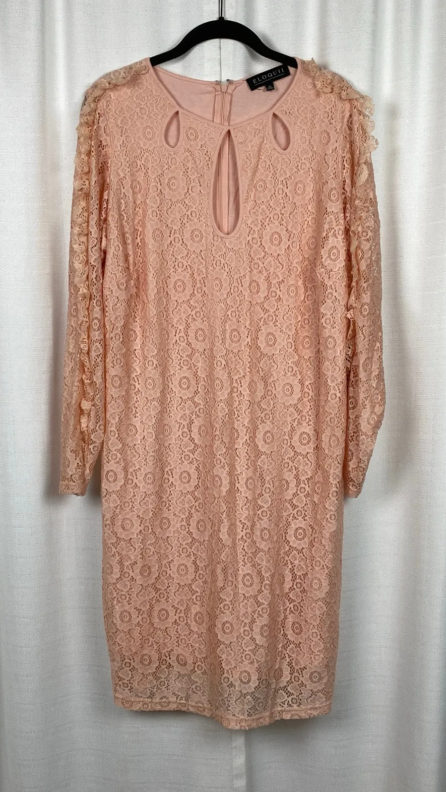Dress is in new condition with no flaws. Approximate measurements when laid flat are: Length from shoulder to hem-42” -Shift Style -Knee Length -Long Sleeve Lace Sleeve -Crewneck With Keyhole Details -Lined -Full Lace Overlay -Zipper Back -Nylon, Elastane & Cotton Casual / Leisure / Lounge / Lounge Wear / Athletic / Athleisure / Office Wear / Work Wear / Career Wear / Business Casual / Party / Special Occasion / Cocktail / Wedding Guest / Shower / Brunch / Bachelorette / Gender Reveal / Picnic / Birthday / Garden Party / Date Night / Girls Night / Vacation / Holiday / Beach / Resort / Cruise / Cozy / Comfortable / Comfy / Girly / Princess / Cottage / Cottagecore / Fairy / Fairycore / Prairie / Prairiecore / Boho / Bohemian / Festival / Lace