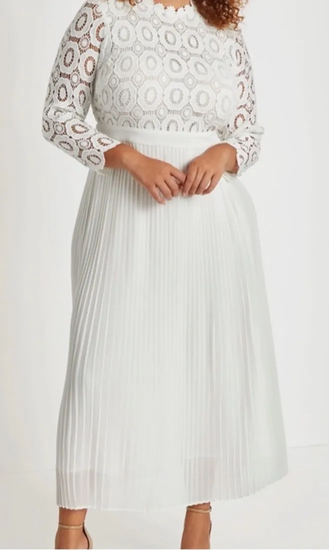 Capture timeless elegance with this stunning ELOQUII white lace and pleated midi dress. Delicate fl... Show more