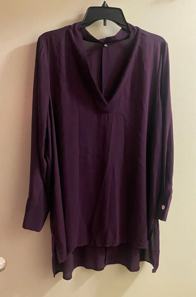 Chic Eloquii design in deep purple. Ideal for fashionable events. Oversized Bust is 48” / pit to pit 24” Length 29” in front 34” in back Sleeves 25” Semi sheer polyester Excellent condition with no fading, wear, stains or damages
