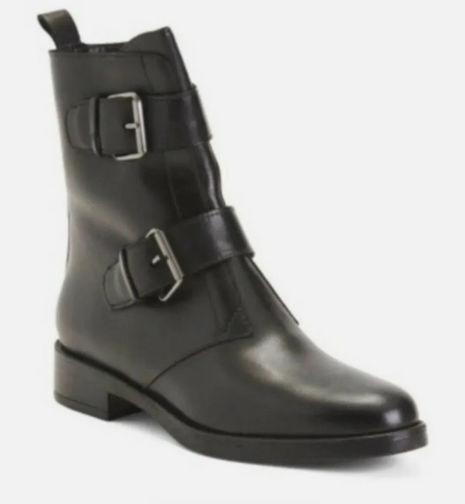 Brand new without box Tags still attached Size 38/ Womens 8 Double Buckle Moto Boots By Emanuele Crasto Made in Italy Features: • Black • Double buckle • Almond toe • Back pull tab • Side zipper closure • Combat Boots • Low block heel • Leather upper • Rubber outsole Measurements: Heel height 1.5 in / 4 cm