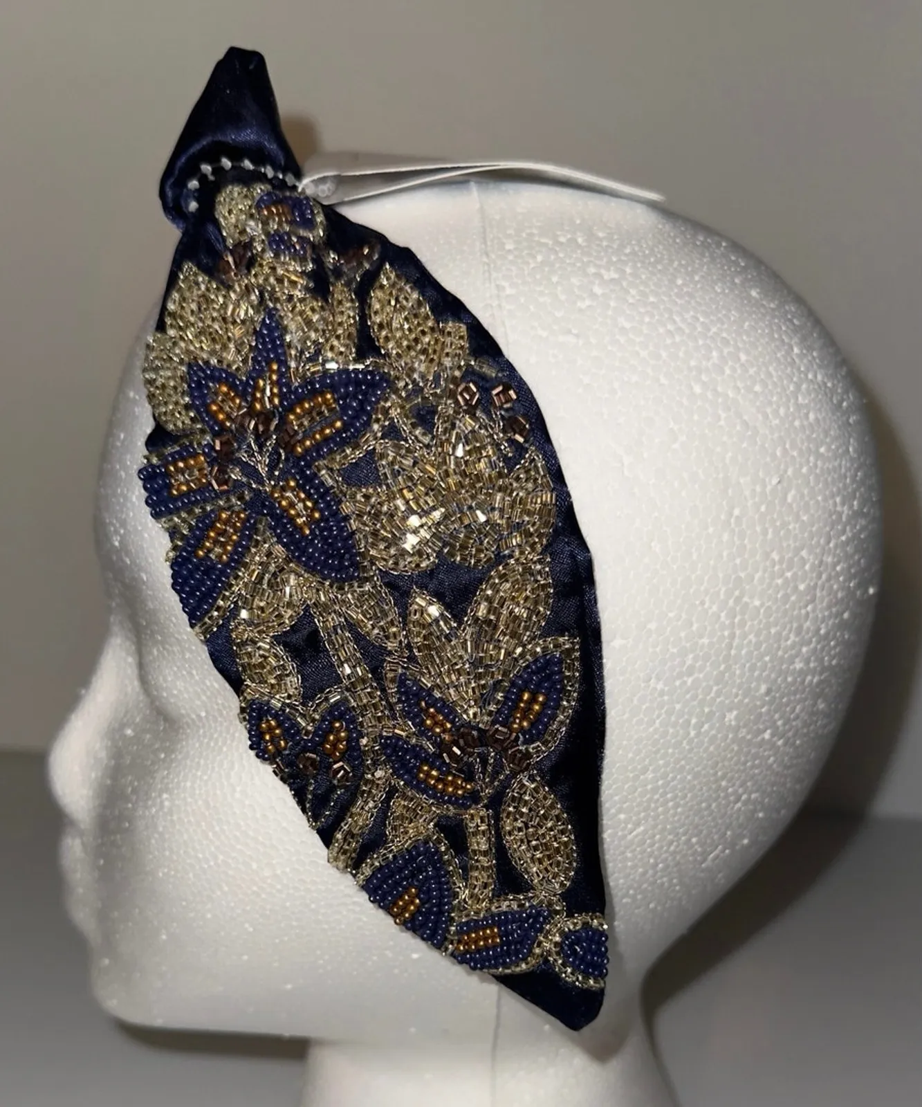 Embellished Beaded Floral Knot Headband – Navy Blue & Gold / Diadema con Nudo Bordada con Cuentas Fl... Show more
