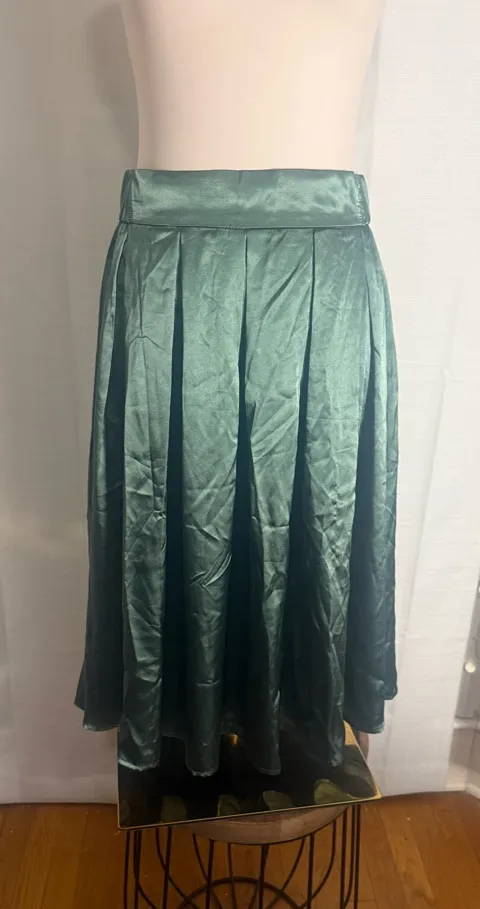 Beautiful emerald green satin midi skirt by Costume Agent. Full, flowy A-line silhouette with pleats... Show more