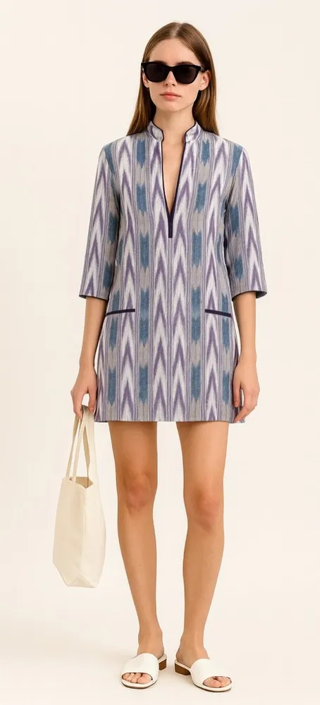 Emerson Fry made in USA cotton ikat tunic mini dress or top. Black silk piping. Hook and eye front. High neck. Purple blue grey print. Size XS. Underarm to underarm: ~20" Center Back to hem: ~30"