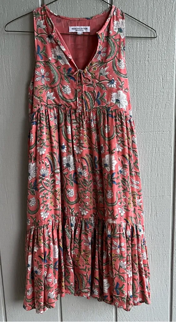 Excellent condition. Cap sleeves have been professionally hemmed to sleeveless (pictured). Organic cotton Hand block printed w/ low impact dye Easy/breezy fit Lined Center back length 34” Neckline opening 9.5" w/ tie closures Nursing friendly Made in Rajasthan, India Hand wash cold, gentle + air dry
