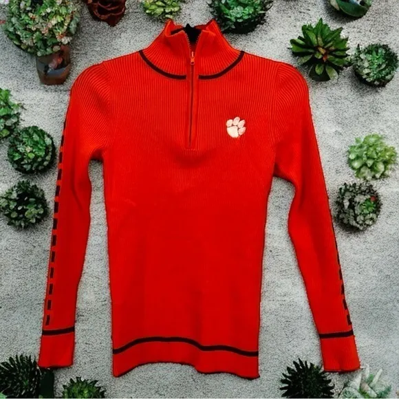 Brand new sample sweater (usually used for photo shoots or store samples) in a fine fitted ribbed knit with 1/4 zip and embroidery at chest and contrast design down each arm. Size is small but would fit an XS because of the ribbing. Orange with white tiger paw and purple contrast design.