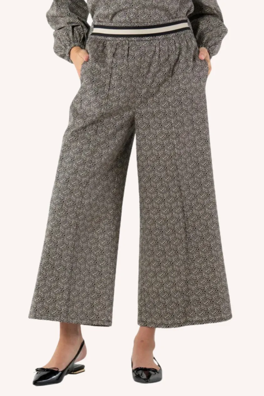 A modern take on laid-back style, the Teddy Crop Trouser features a relaxed wide leg silhouette with an elastic waistband and practical side pockets. The black and white striped trim adorns the waistline with a graphic pop, complementing the Black Tonal Monogram print—a subtle nod to the brand with our signature logo in a chic, repeating pattern. Designed for comfort and style, these cropped trousers offer a versatile foundation for elevated everyday dressing. Sizing Guide: XXS: 00/0 XS: 0/2 S: 4/6 M: 6/8 L: 10/12 XL: 14/16 XXL: 16/18