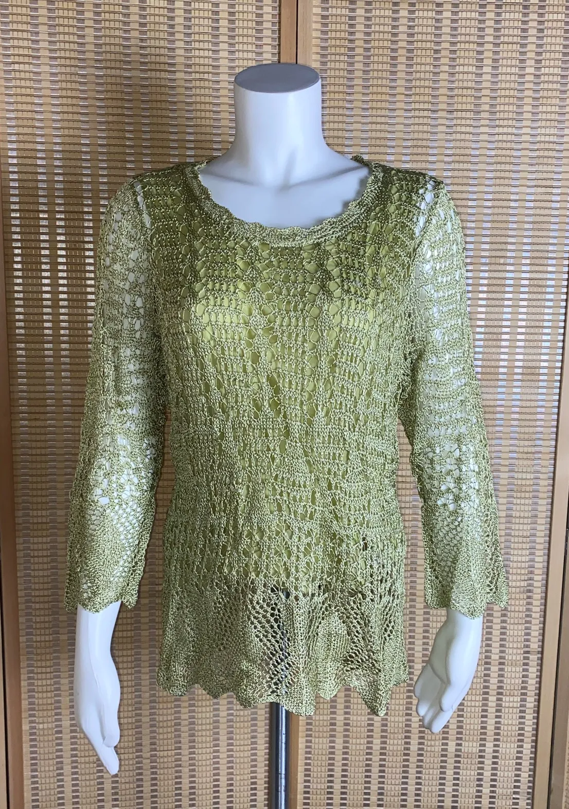 Emma & James Woman’s Large Boho Crochet Knit Lined Sweater Top 3/4 length sleeves and a scalloped he... Show more