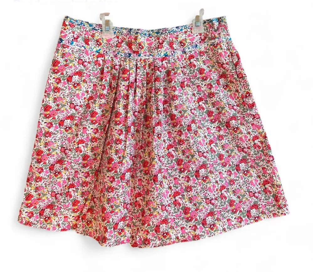 Emmelee for Francesa's Collection Pink Floral Short Skirt Sz Large pink, blue, white, green floral pattern. 100% cotton. approx 15" waist, 19" long. great pre owned condition side zipper closure, lined, pockets. boho summer cottagecore girly short skirt fairycore
