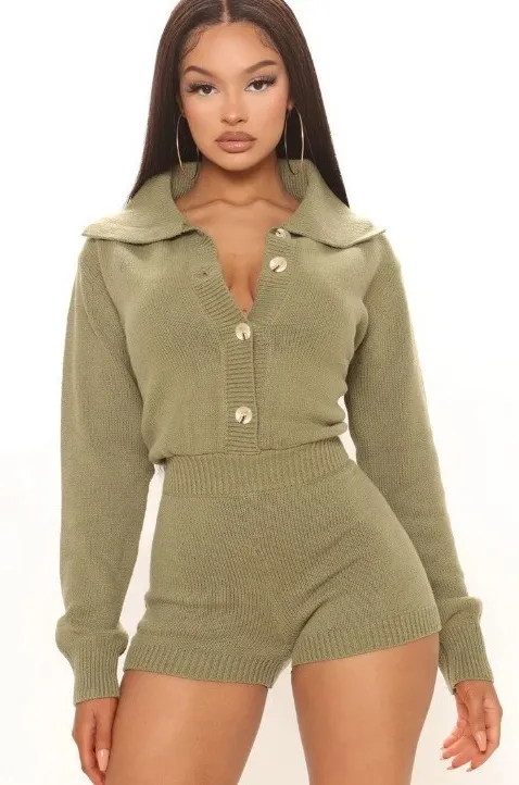 Emory Park olive green knit romper with a button-front closure and collared neckline. Long sleeves w... Show more
