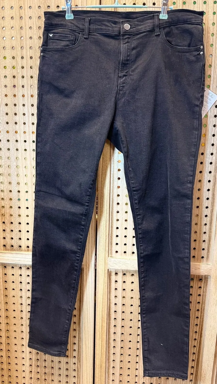 Classic black skinny jeans designed for women. Features a traditional five-pocket design, with the back pockets embellished with the brand's iconic logo. Includes a zipper fly with button closure, belt loops and brand label on the back waistband. These jeans offer a sleek silhouette with comfort and versatility. Style: Skinny Color: Black Department: Women Type: Jeans Fabric Wash: Dark Accents: Logo Features: Pockets, Slimming Waist Size: 32 in Fit: Skinny Pattern: Solid Fabric Type: Denim Inseam: 32 in Material: Cotton, Spandex Closure: Zip, Button Keywords: Emporio Armani, J20, Jeans, Skinny Jeans, Black Jeans, Women's Jeans, Designer Jeans, Size 32, Slim Fit, Classic, Brand Item is preowned, effort has been made to ensure all flaws are displayed photos serve as additional description Sizing varies by manufacturer and time period, please see measurements.