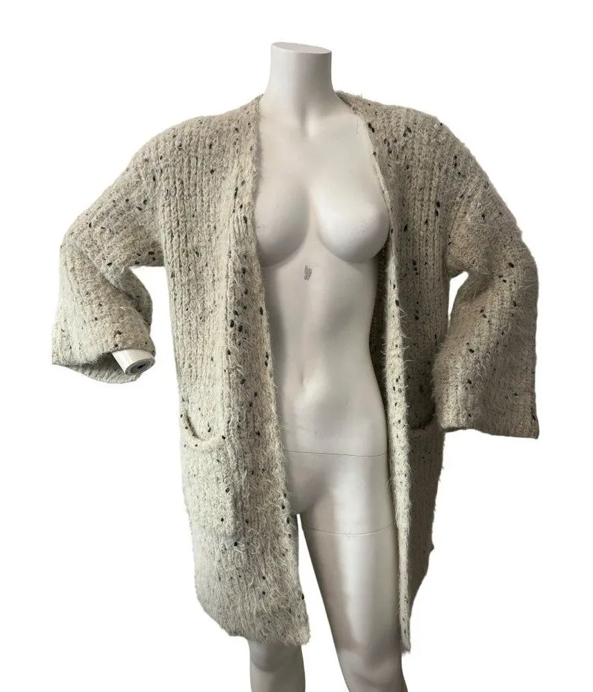 Pre owned - great condition - no flaws Features: • slits at each side of the sweater • roomy front pockets • open wrap style sweater • bell sleeves for a bit of flair • silver metallic color with hints of black and gold • bell sleeves wrap sweater • super thick and warm and cozy • open wrap style so no enclosures or buttons • can be belted with an extra accessory not included nylon acrylic polyester blend material Size: SM PTP 21 inches Sleeve 17 inchers Length 32 inches metallic festive winter holiday NYE cozy layers essentials cold weather party