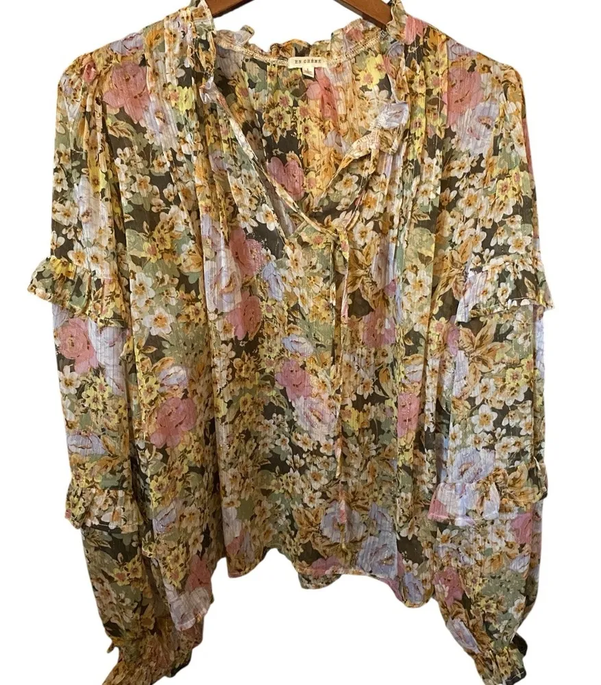 En Creme sheer floral pink gold yellow ruffle long sleeve tie front blouse beautiful blouse w/ shiny gold thread through it . ruffle details at color & sleeves . tie in a bow or leave open , light weight comfortable. c282725 coquette girl , romantic. ethereal , boho , boho western girlhoodcore core. fall , ethereal